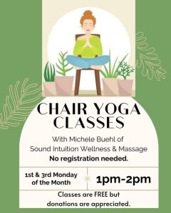 Join Michele Buehl of Sound Intuition Wellness and Massage for chair yoga classes.