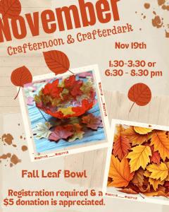 Join us for Crafternoon & Crafterdark! In November, create a Fall Leaf Bowl! A balloon, modpodge, and leaves is all you need to make a Fall Leaf Bowl.
