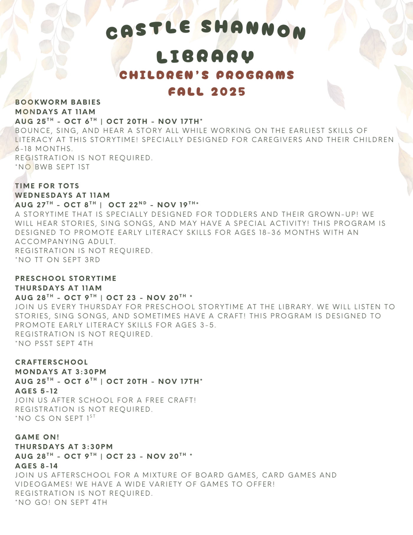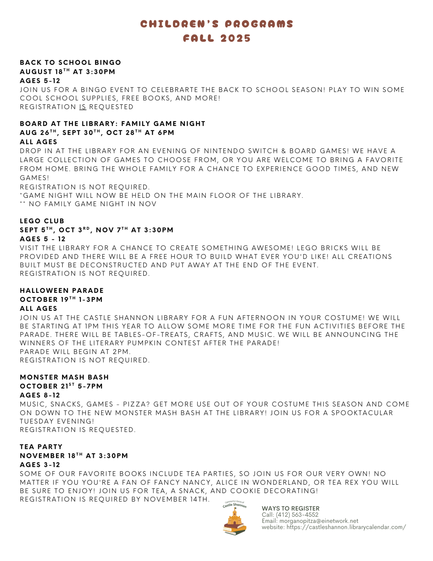 For more information about upcoming programs and events, please visit https://castleshannon.librarycalendar.com/events/month/2025/11