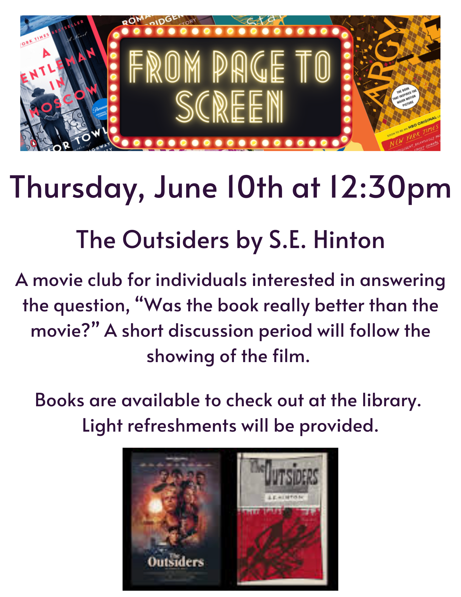 Is the book always better than the movie? Read The Outsiders by S.E. Hinton before Thursday, June 10th when we will watch the movie starring Patrick Swayze, Matt Dillon and Rob Lowe.