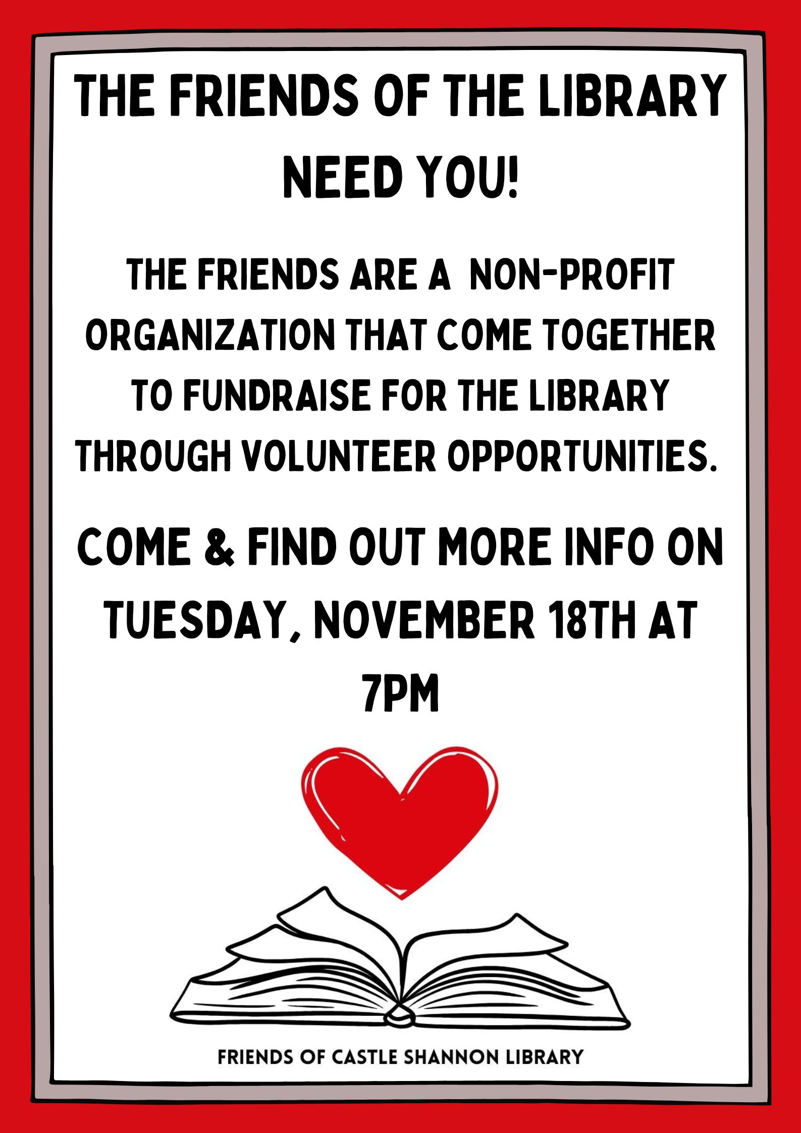 Tuesday, November 18th at 7pm Find out about the Library’s Friends Group… *What they do for the Library *How they support the Library *How you can get involved Everyone is welcome to attend.